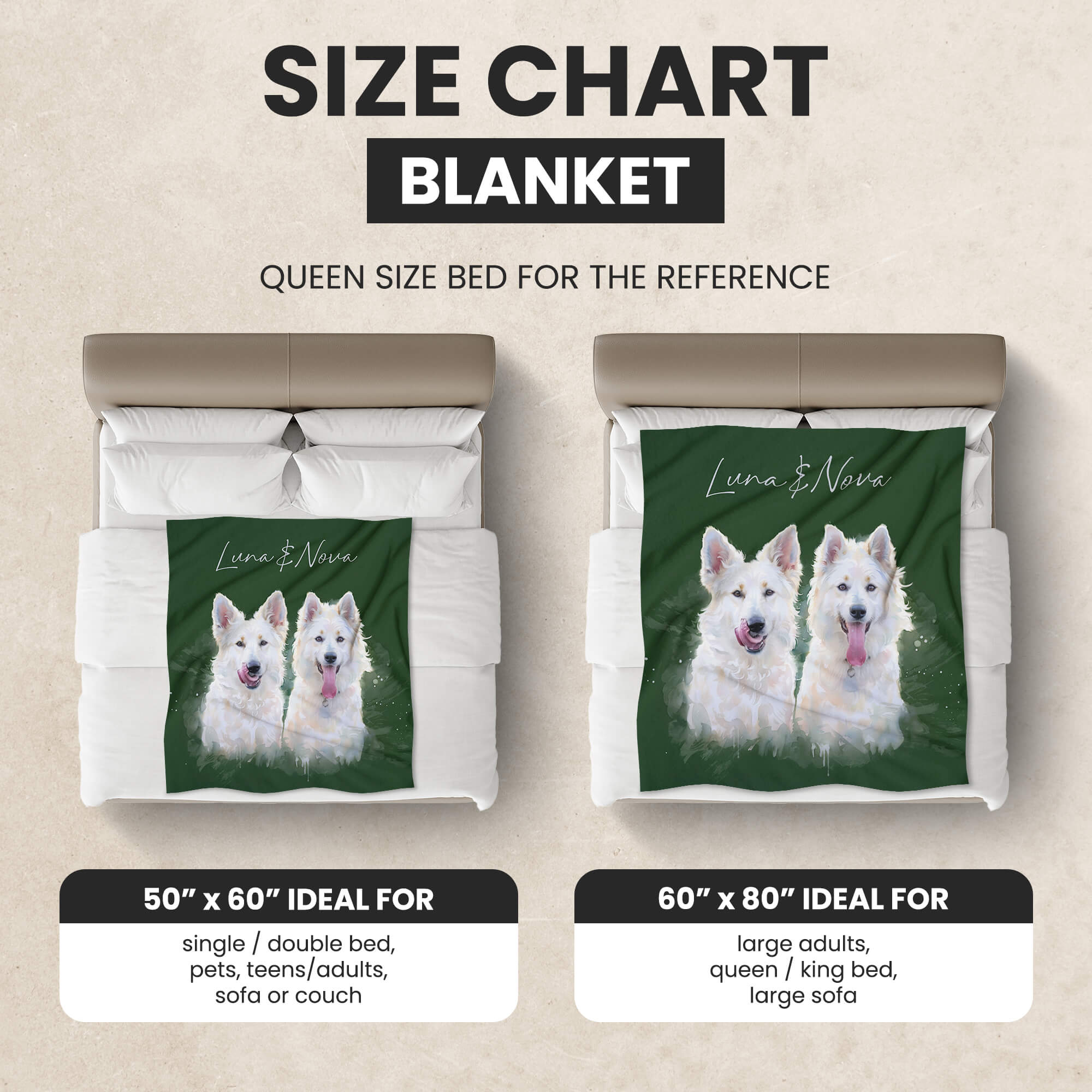 Select the number of pets you'd like to include in the portrait and blanket size. If you're unsure, no worries—place your order now! You can make adjustments when we confirm the artwork with you.